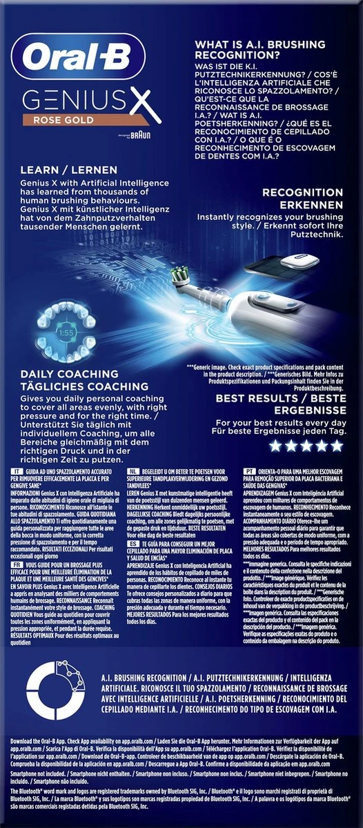 De Oral-B Genius X is voorzien van bewegingssensoren en aangedreven door artificiële intelligentie om uw poetsstijl te herkennen en u elke dag te begeleiden voor de beste resultaten. Het was nog nooit zo gemakkelijk om te poetsen zoals uw tandarts dat aanbeveelt voor een superieure reiniging en gezonder tandvlees. Deze prachtige geavanceerde tandenborstel beschermt uw gevoelige tandvlees en helpt toekomstige problemen voorkomen: de combinatie van de revolutionaire Gum Guard-technologie, 360 SmartRing en poetsdruksensor waarschuwen u, verminderen de snelheid als u te hard poetst en laten u weten wanneer u te lang op een plek poetst voor een zachtere poetsroutine. Ten slotte wordt hij geleverd met een lithium-ion-batterij die meer dan 2 weken meegaat met 1 oplaadbeurt. Met de Oral-B Genius X Speciale Editie kunt u niet verkeerd poetsen. Geen wonder dat Oral-B het meest aanbevolen merk door tandartsen wereldwijd is.