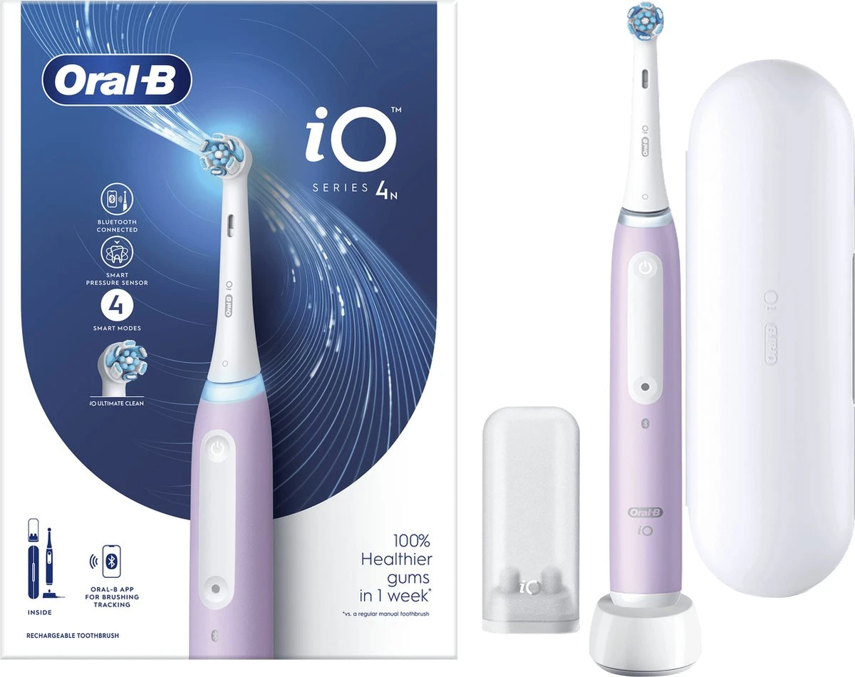 De iO 4 elektrische tandenborstel is voorzien van de beste technologie van Oral-B en combineert een door tandartsen geïnspireerde ronde borstelkop met micro-vibrerende borstelharen voor een professioneel reinigend gevoel thuis. De slimme poetsdruksensor helpt voorkomen dat u te hard of te zacht poetst om uw tandvlees beter te beschermen. Gum Guard waarschuwt u als u te veel druk op uw tanden uitoefent. Vervang uw Oral-B iO opzetborstel elke 3 maanden voor de beste resultaten.