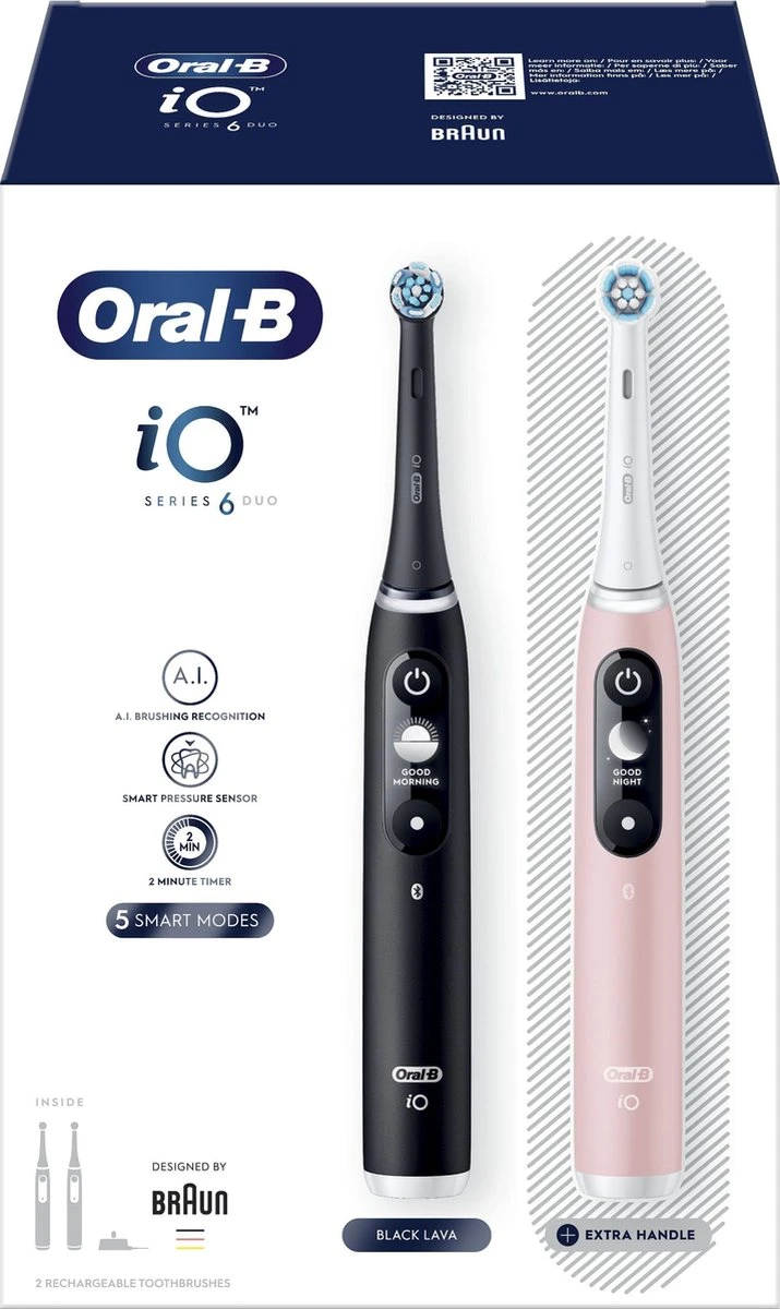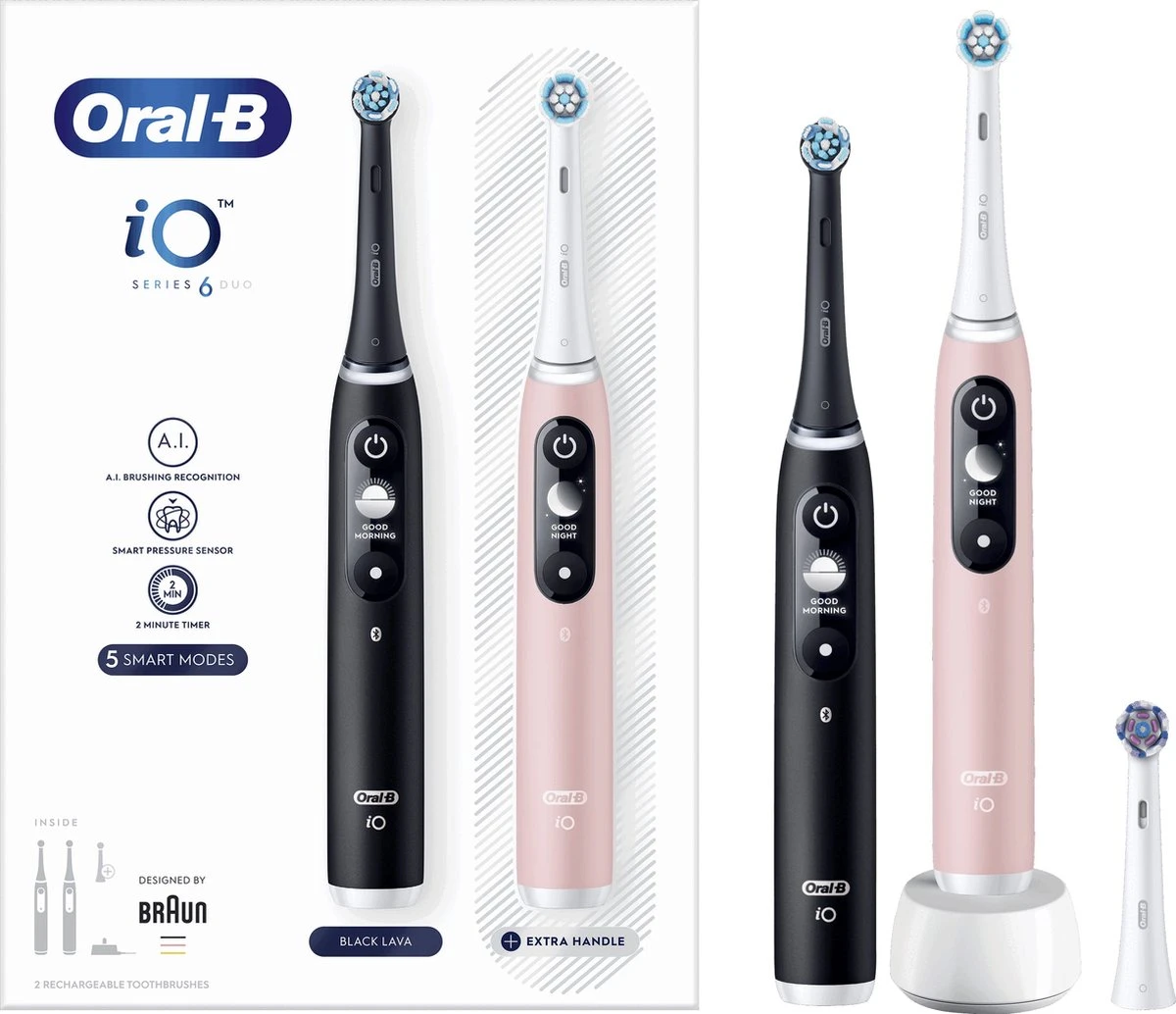 - Bevat: 2 iO6-handvatten met 1 gentle clean borstelkop, 1 ultimate clean borstelkop, 1 radiant white borstelkop, 1 oplader