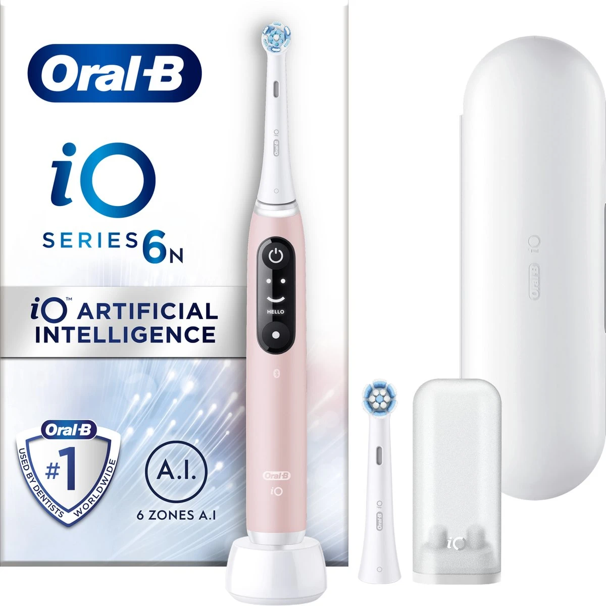 - Inhoud: 1 iO6-handvat met 2 opzetborstels, 1 reisetui, 1 oplader, 1 opzetborstelhouder