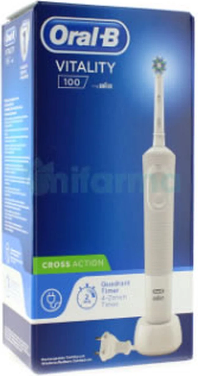 De Oral-B Vitality 100 CrossAction elektrische tandenborstel biedt een klinisch bewezen superieure reiniging in vergelijking met een gewone manuele tandenborstel. De CrossAction borstelkop omhult elke tand met borstelharen die in een hoek van 16 graden zijn geplaatst en de 2D-reinigingsactie oscilleert en roteert om zo meer tandplak te verwijderen dan een gewone manuele tandenborstel. De geïntegreerde timer op het handvat helpt u 2 minuten te poetsen zoals door tandartsen wordt aangeraden. Bovendien wordt deze elektrische tandenborstel aangeboden door Oral-B, het merk dat het meest door tandartsen wereldwijd wordt gebruikt. Past op de volgende vervangende opzetborstels: Cross Action, 3D White, Sensi Ultrathin, Sensitive Clean, Precision Clean, Floss Action, Tri Zone, Dual Clean, Power Tip, Ortho Care.